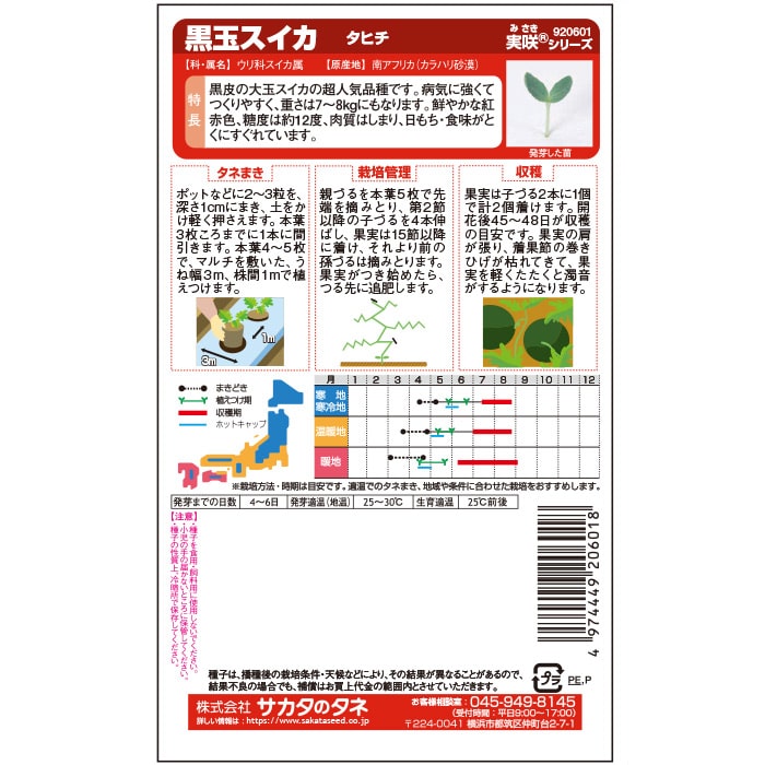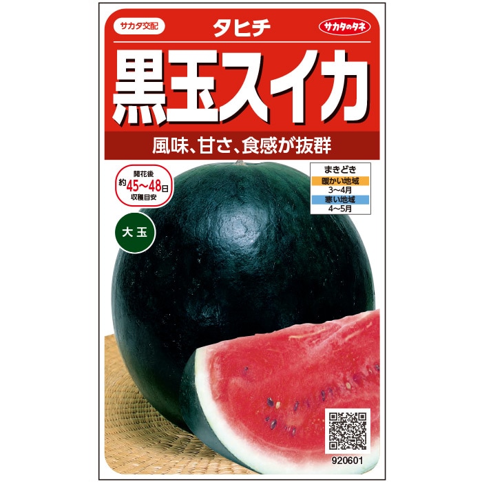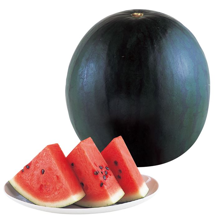 黒皮大玉スイカの超人気品種。病気に強くて作りやすく7~8kgにもなります。果肉は鮮やかな紅赤色、糖度は約12度、日持ちと食味に優れています。
