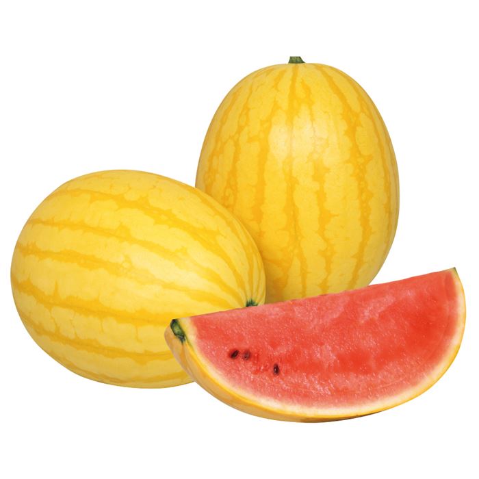 淡黄色の外皮に濃黄色のしまが入る独特な外観の楕円(だえん)赤肉中玉スイカです。同じタイプのスイカとしては、硬めの肉質でシャリ感が強く食味がよいです。