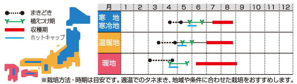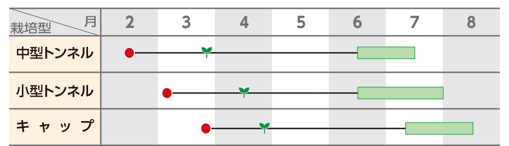 トンネル栽培、露地栽培が可能。トンネル栽培で開花後45~48日、露地栽培では30~35日で収穫できます。