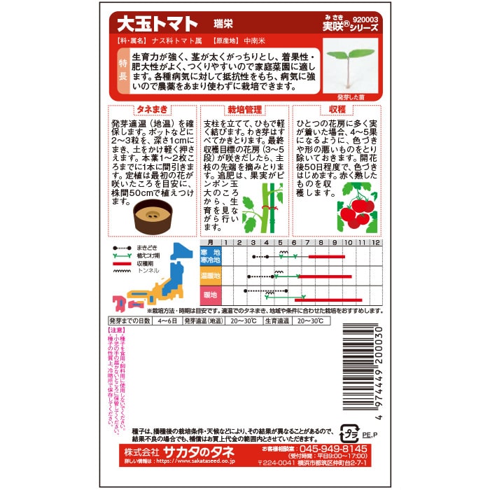 病気に強く、作りやすい早生種。乱形果、空洞果、すじ腐れが少なく、赤く熟しても玉質のしっかりしたおいしいトマトが収穫できます。