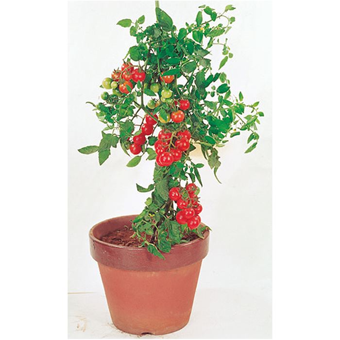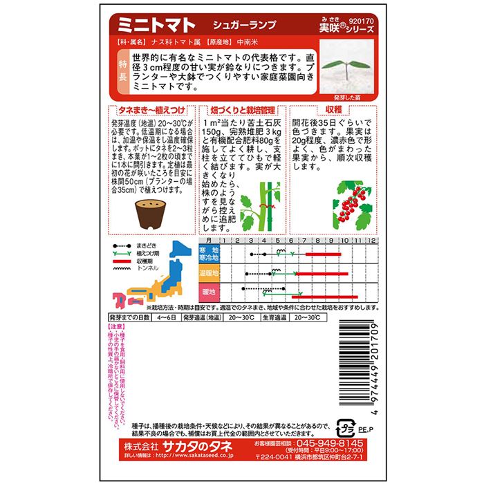 世界的に有名なミニトマトの代表格です。直径3cm程度の甘い実が鈴なりに付きます。節間が短く、生育が非常に旺盛なので2~3本仕立てにして光が当たるように誘引します。他のミニトマトよりも肥料は控えめに栽培します。