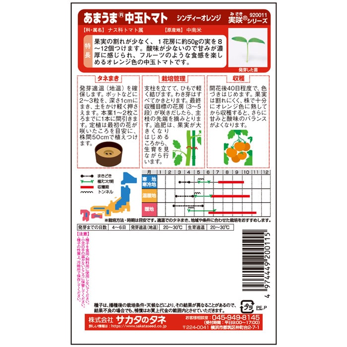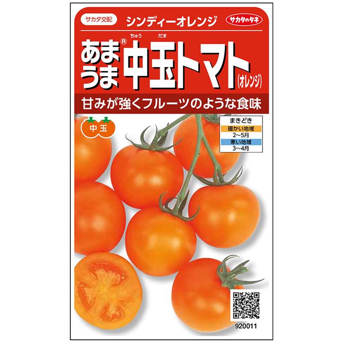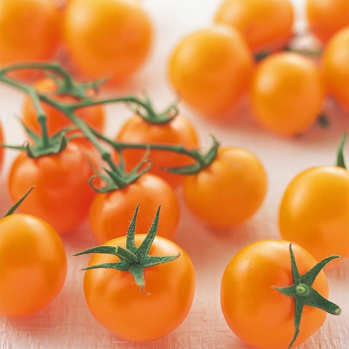 鮮やかなオレンジ色の中玉トマト。甘みが強く、フルーツのような食感がとってもおいしい。裂果の発生が少なく、房どりもできます。草勢はやや強く、スタミナがあるので長期間収穫できます。