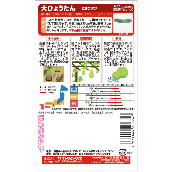 日よけ・観賞用のほか、果実を加工して置物やおもちゃにして楽しめます。果実は長さ約30cm、直径15cmほどになります。