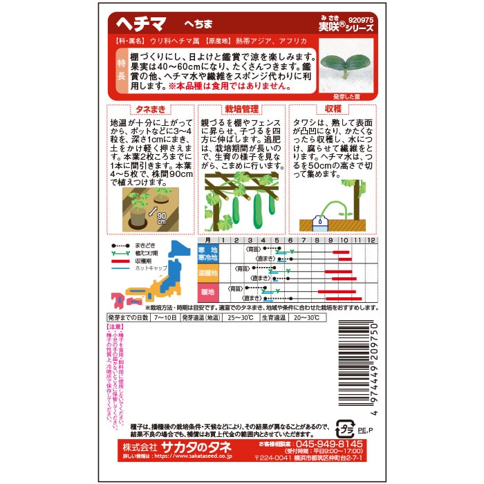 棚づくりにし、日よけと観賞で涼を楽しみます。実の長さが40~60cmにもなり、たくさんつきます。観賞用のほか、ヘチマ水や繊維をスポンジ代わりに利用します。