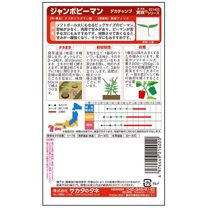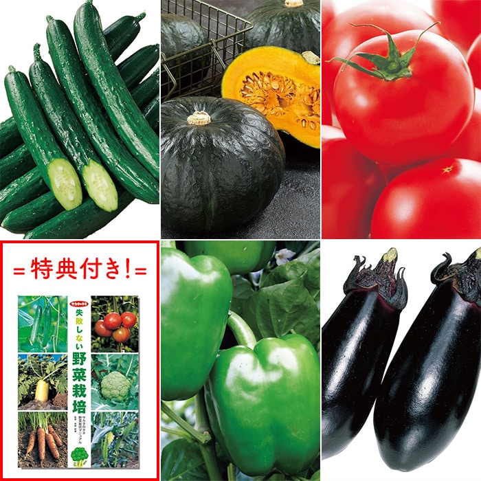 - 大玉トマト 麗夏 (約21粒)、栗カボチャ ブラックのジョー(R) (約6粒)、キュウリ ずーっととれる (約16粒)、ナス 黒福 (約80粒)、ジャンボピーマン デカチャンプ (約40粒)、野菜栽培マニュアル「失敗しない野菜栽培」