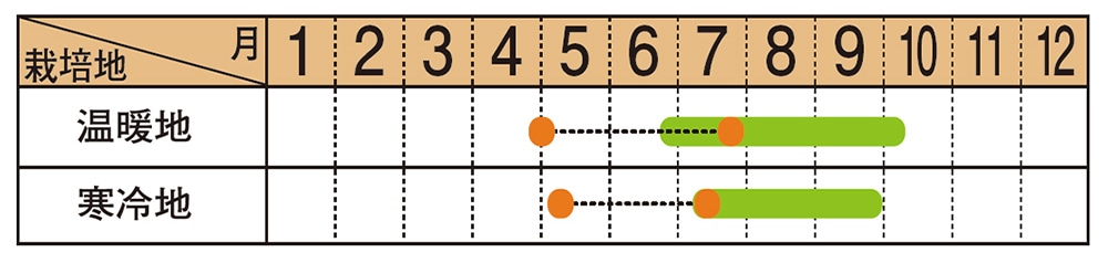 沖縄県で開発された品種で、暑さに強いのが最大のウリ。収穫の最盛期は真夏です。柔らかくて甘みのある莢がどんどん付きます。つるあり種で収穫期間が長く、10月上旬までとれ続けます。