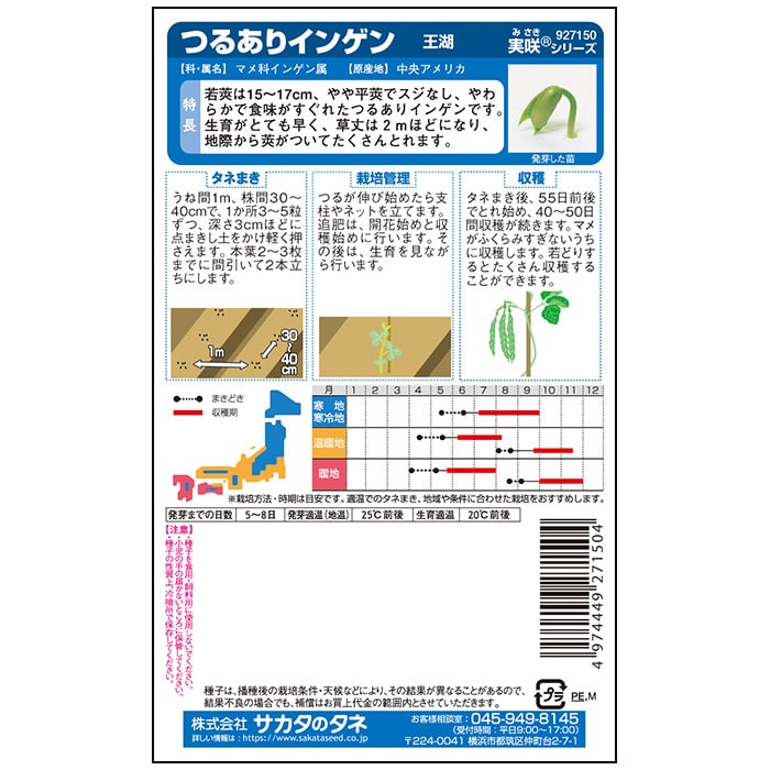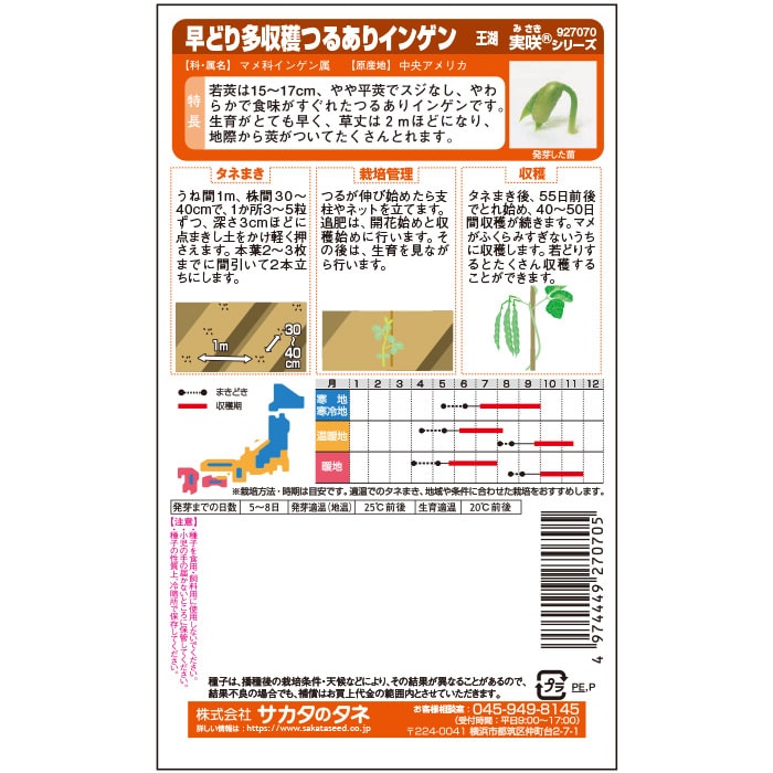 春まきと夏まきが可能。若莢を食べる超極早生種。草丈は2m余りになり、写真のように地際からたくさん莢が付くので、たっぷり収穫できます。