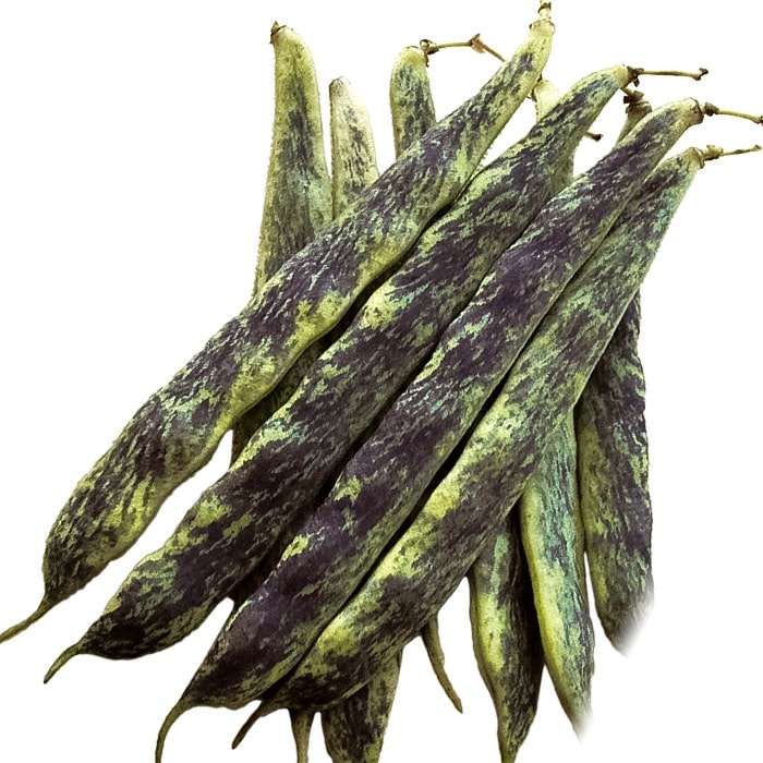 紫色のしま模様が鮮やかで約15cmの長さになる平莢インゲン。ゆでてあえ物やサラダ、炒め物がおすすめです。