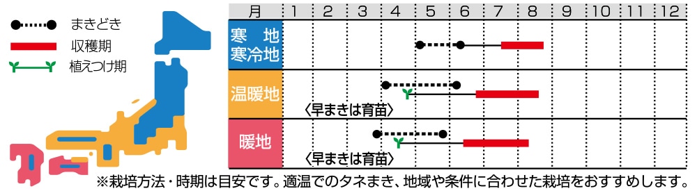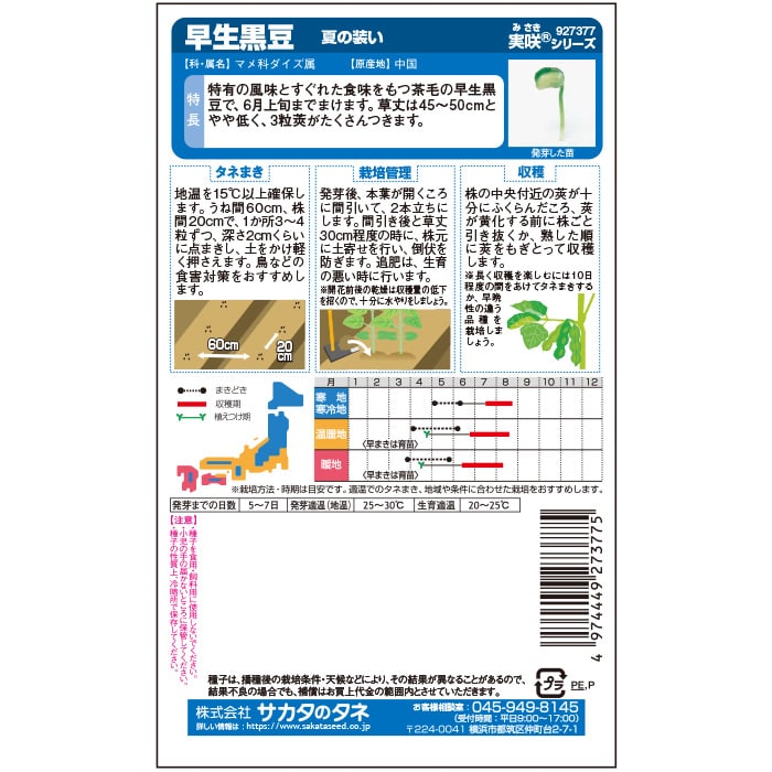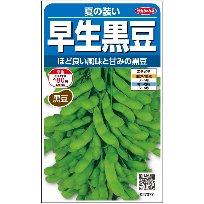 香りよく、甘みが強く、抜群においしい黒豆。風味と甘みとモチッとした食感が織りなす独特の味は、一度食べるとやみつきになります。6月上旬までまくことができる早生種。収穫期の目安は、莢がパンパンに膨れる一歩手前くらいです。何莢か試食しながらタイミングを計ってください。