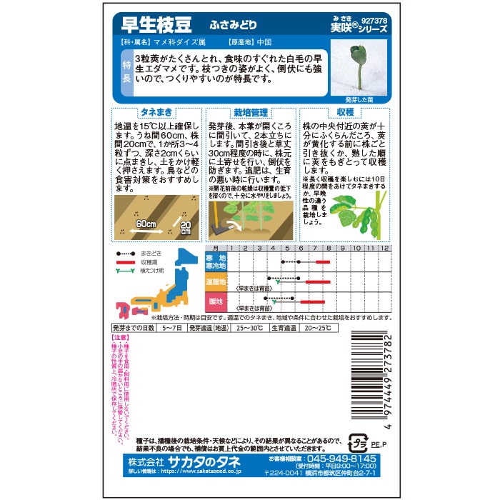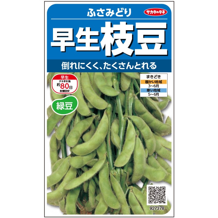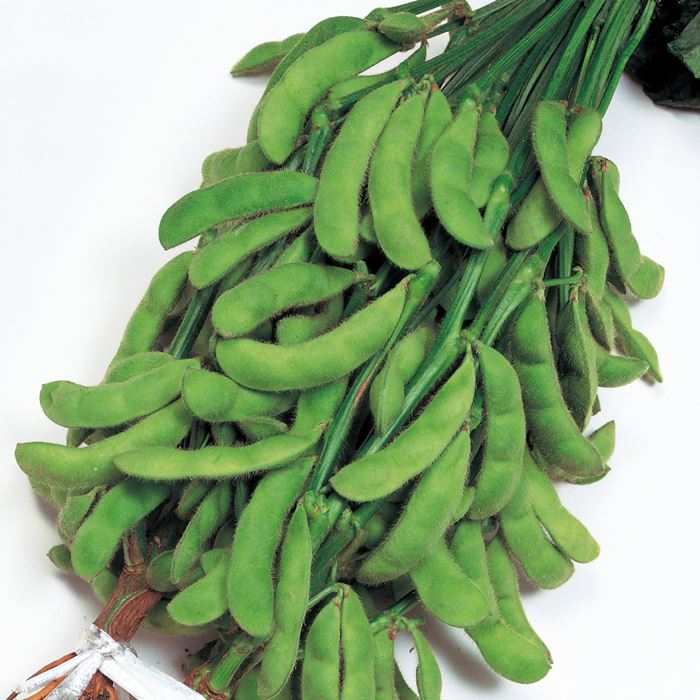 3粒莢がたくさんとれ、食味のすぐれた白毛の早生エダマメです。枝つきの姿がよく、倒伏にも強いので、つくりやすいのが特長です。