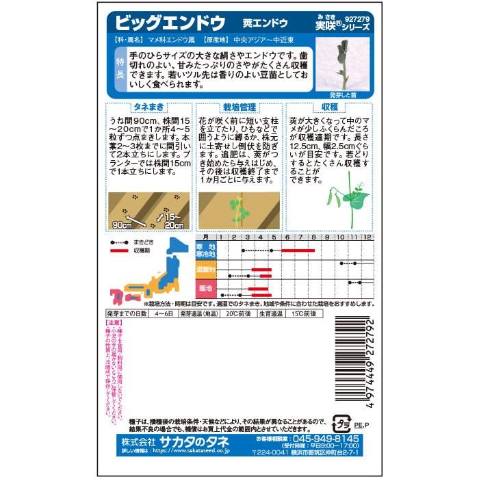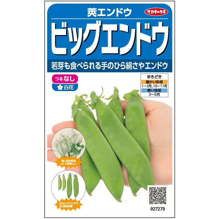 手のひらサイズの大きな絹莢エンドウです。歯切れのよい、甘みたっぷりの莢がたくさん収穫できます。若いつる先は豆苗として食べられます。