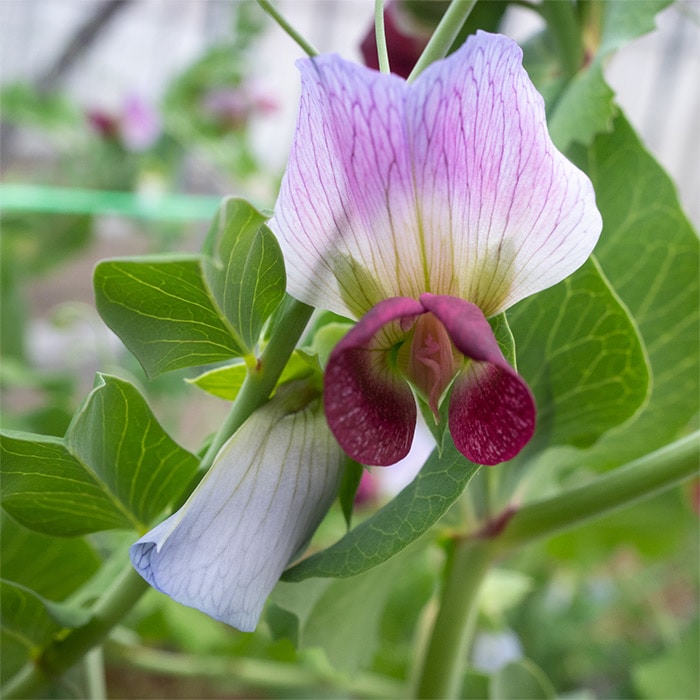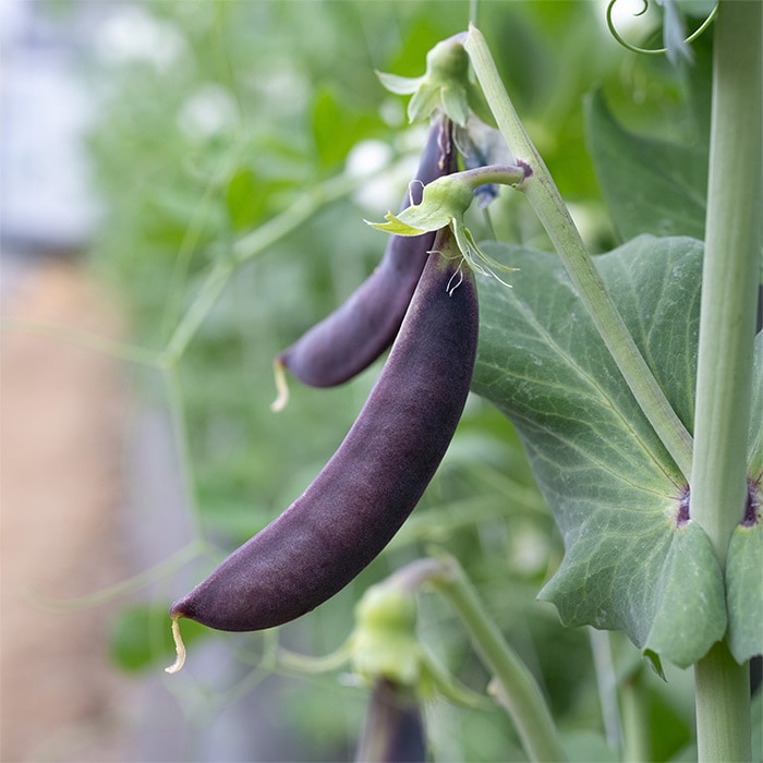 莢の色が紫色のスナップエンドウです。ゆでると色は少し薄くなりますが、紫色は残ります。莢はやや短めの中莢で、1花房に2莢ずつ付きやすいのでたくさんとれます。