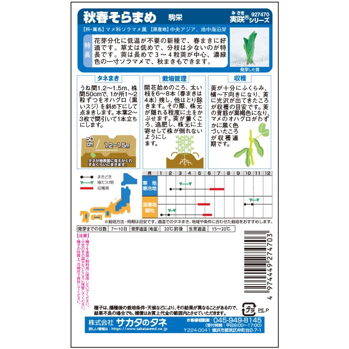 花芽分化に低温が不要な品種なので、春まきもできます。草丈は低めで、分枝が少ないのが特徴。莢は長めで3粒莢が中心です。