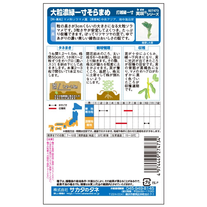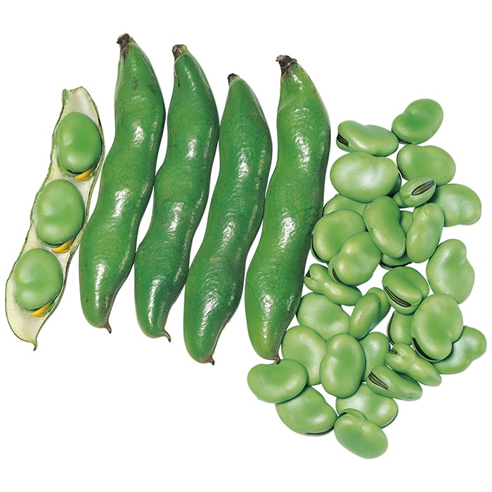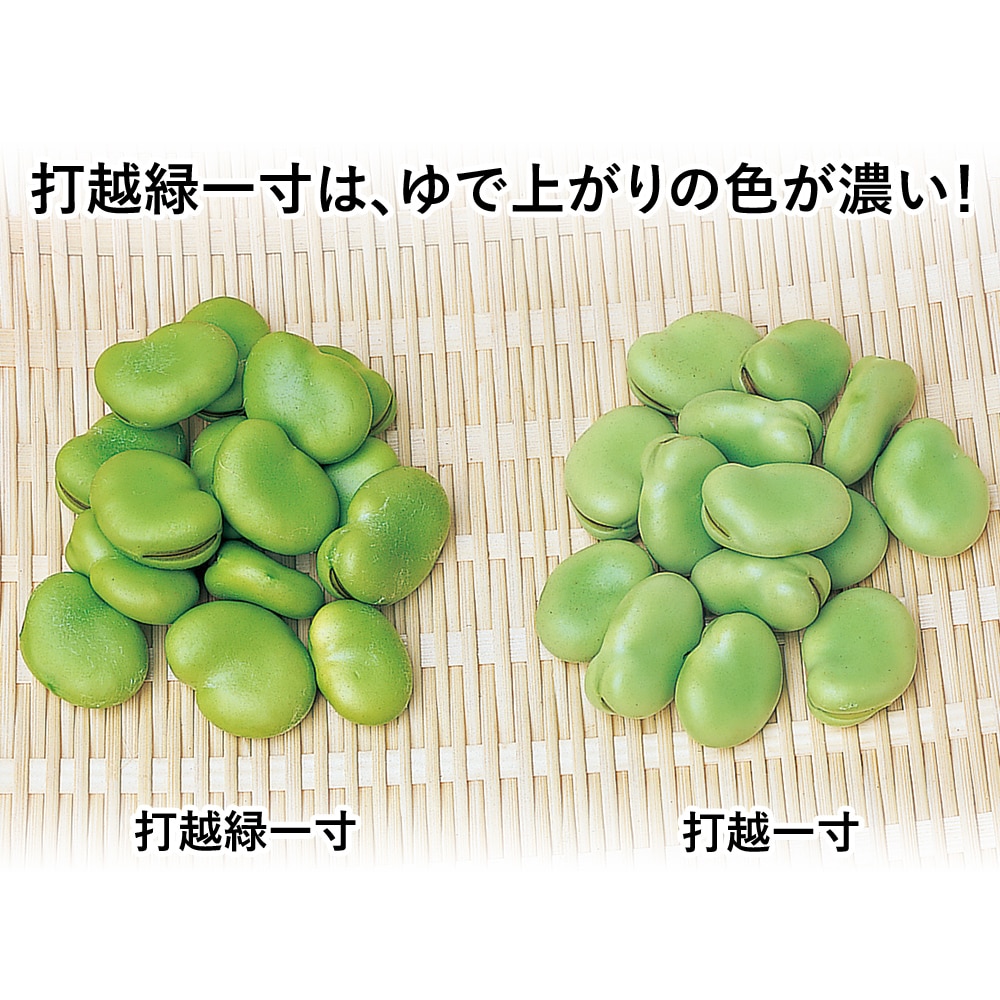 「打越一寸」と同じように優れたソラマメの性質を持ち、莢の色は光沢があり、むき実の色は濃い緑色。一番の特長は、ゆで上がりの美しい色です。莢はやや細身でスマートですが、むき実は3cm前後の大きさでそろいます。