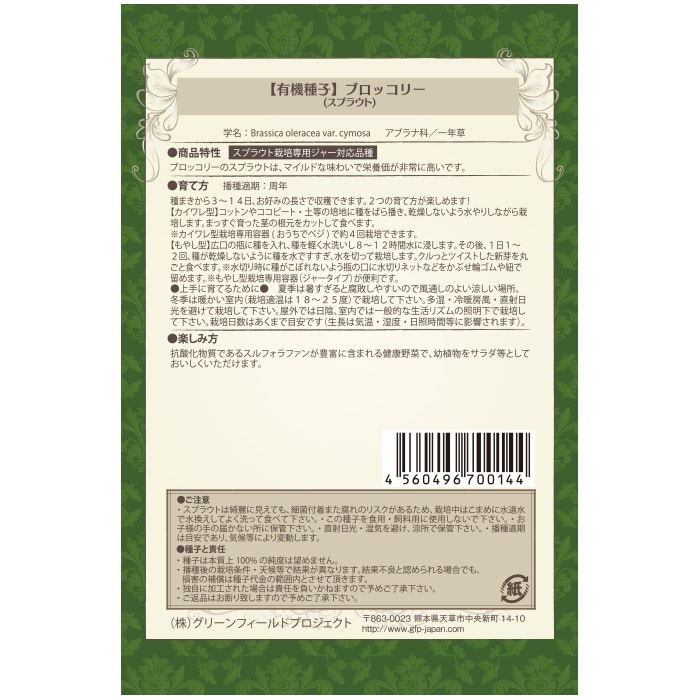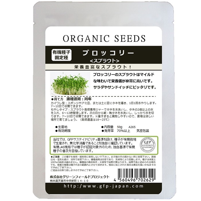 化学農薬・化学肥料を使用せずに栽培した親株から採取したタネです。遺伝子組み換えなし、化学種子消毒なし。ヨーロッパ有機認証取得の有機種子シリーズです。全てのスプラウト栽培用のタネに食品検査を実施しています。安心して栽培をお楽しみください。