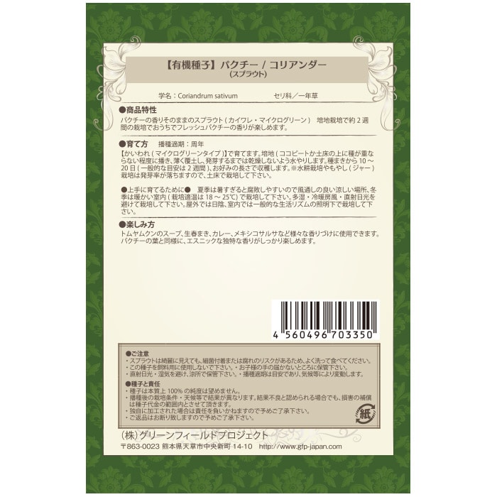 化学農薬・化学肥料を使用せずに栽培した親株から採取したタネです。遺伝子組み換えなし、化学種子消毒なし。ヨーロッパ有機認証取得の有機種子シリーズです。全てのスプラウト栽培用のタネに食品検査を実施しています。安心して栽培をお楽しみください。
