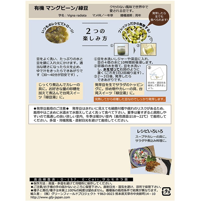 化学農薬・化学肥料を使用せずに栽培した親株から採取したタネです。遺伝子組み換えなし、化学種子消毒なし。ヨーロッパ有機認証取得の有機種子シリーズです。全てのスプラウト栽培用のタネに食品検査を実施しています。安心して栽培をお楽しみください。
