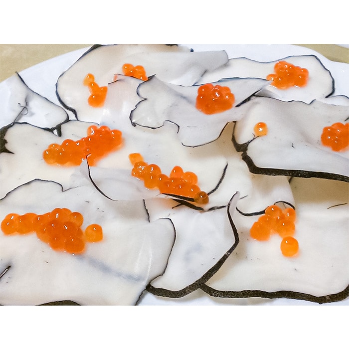 真っ黒な外皮に純白の果肉。お料理のアクセントに。