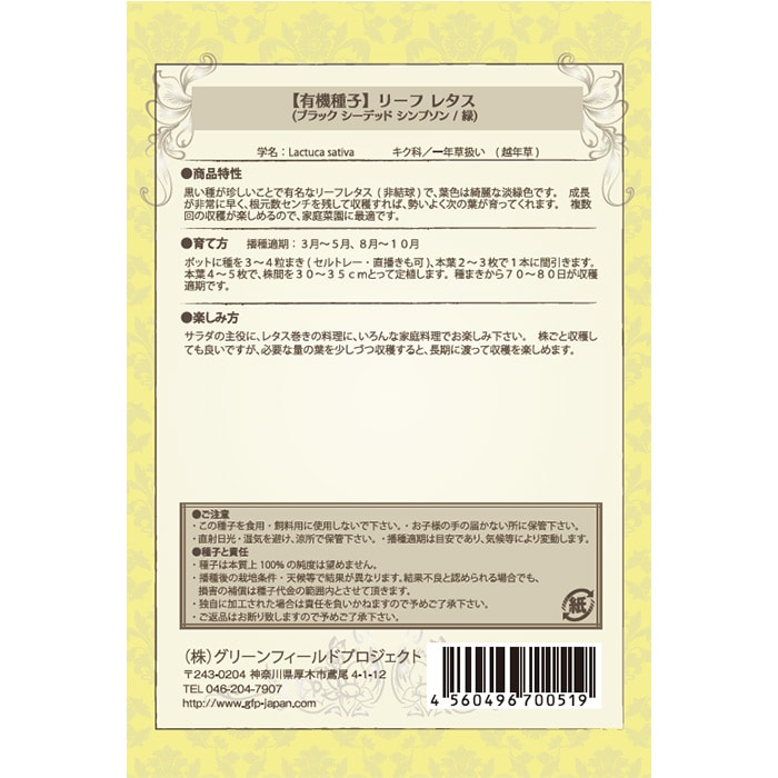 有機種子 リーフレタス ブラックシーデッドシンプノン 緑