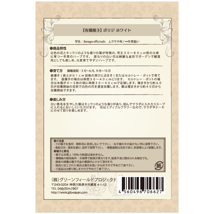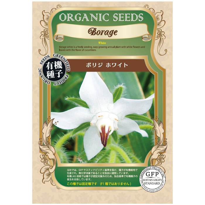 房なりの白い花は綺麗な星形でガーデンで観賞用としても楽しめ、大変育てやすいハーブです。白い柔毛を生やした葉はキュウリのような香りがあり、刻んでサラダに入れたりスープに入れるとおいしくいただけます。