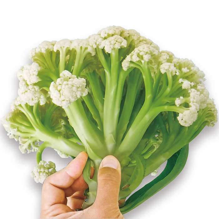 通常のカリフラワーサイズでも収穫できますが、花蕾を膨らませて伸びた小花蕾の茎は甘くて柔らかくおいしいです。