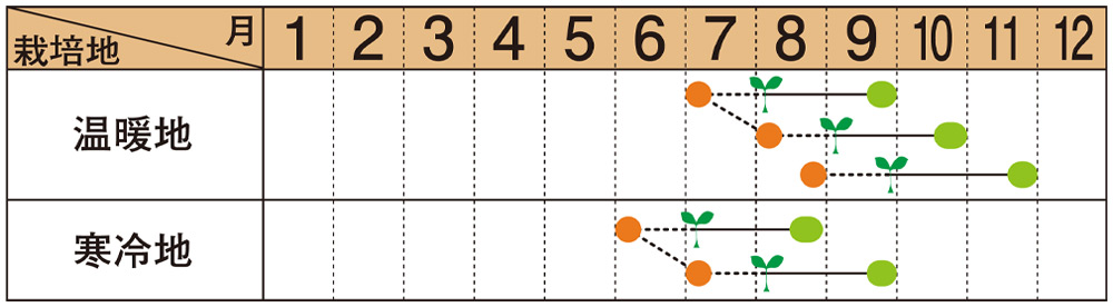 定植後約40日で収穫できる極早生種です。株元からのわき芽が出やすく1株から1~2個のわき芽が収穫できます。茎は柔らかく甘みがあるので、茎までおいしく食べられます。