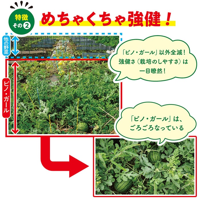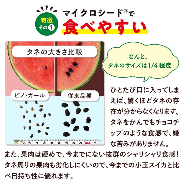 ひとたび口に入ってしまえば、驚くほどタネの存在が分からなくなります。タネはチョコチップのような食感で、嫌な苦みもありません。また果肉は硬めで、今までにない抜群のシャリシャリ食感!タネ周りの果肉も劣化しにくいので、今までの小玉スイカと比べ日持ち性に優れます。