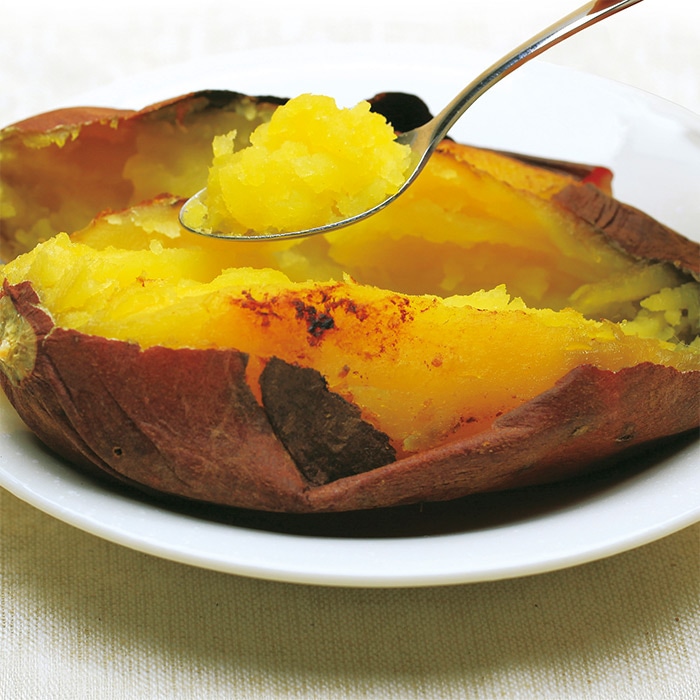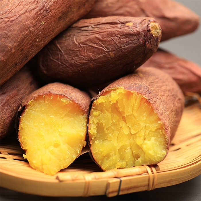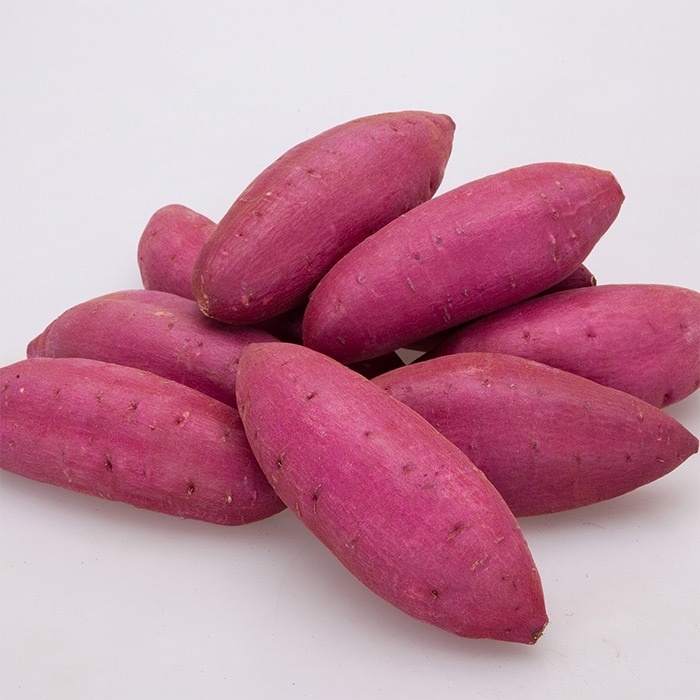 上品な甘さと絹のように滑らかな舌触りがあり、スイーツ感覚で味わえます。皮は濃赤紫色で貯蔵性がよく、干しイモとしてもおいしく食べられます。