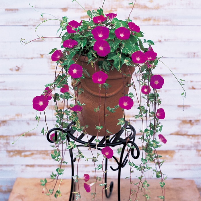 花色は濃桃色で小輪です。つるがあまり伸びないので、つり鉢やハンギングにおすすめです。