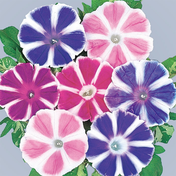 花の中心から放射状に延びた白い筋が星のように見えるかわいらしいアサガオです。花は10~13cmと大輪で見応えがあります。