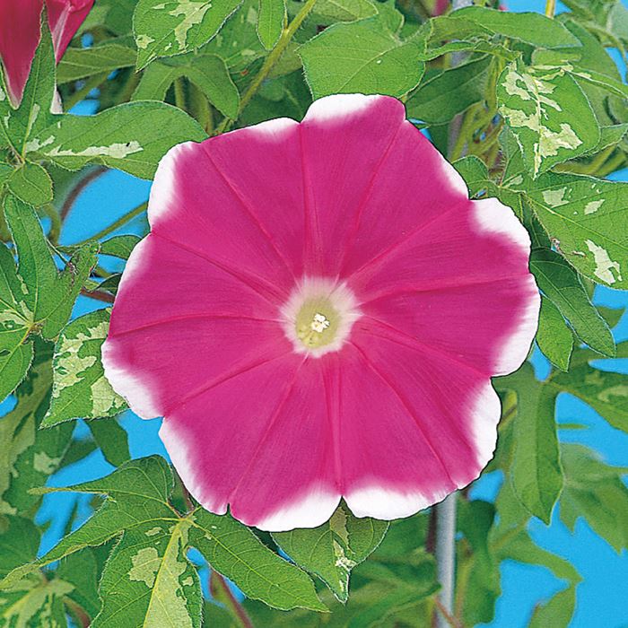 超巨大輪。葉に斑が入ります。つるがあまり伸びないので、あんどん仕立てや鉢植えでトレリスにもおすすめです。