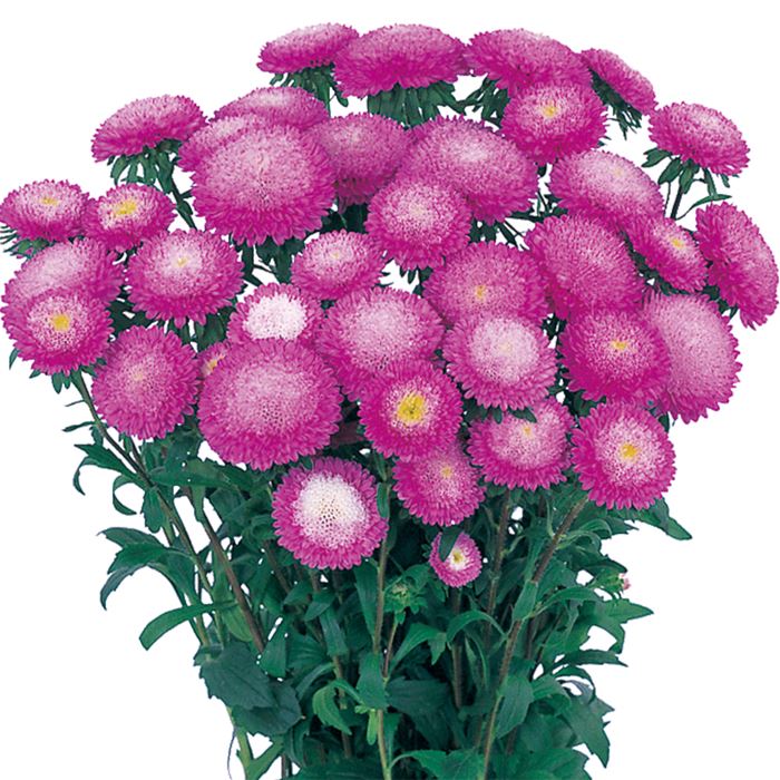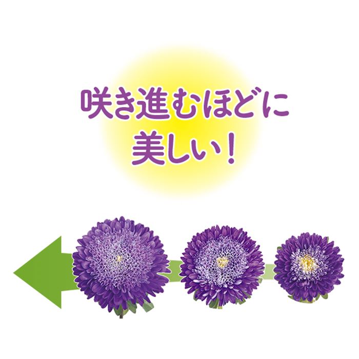 花弁の重ねが厚くボリュームたっぷりの大輪アスター。花形の整ったポンポン咲きで、咲き進みながら表情を変えます。「松本」シリーズと同程度の萎凋病耐病性品種です。「松本」シリーズより5~7日開花が遅いです。