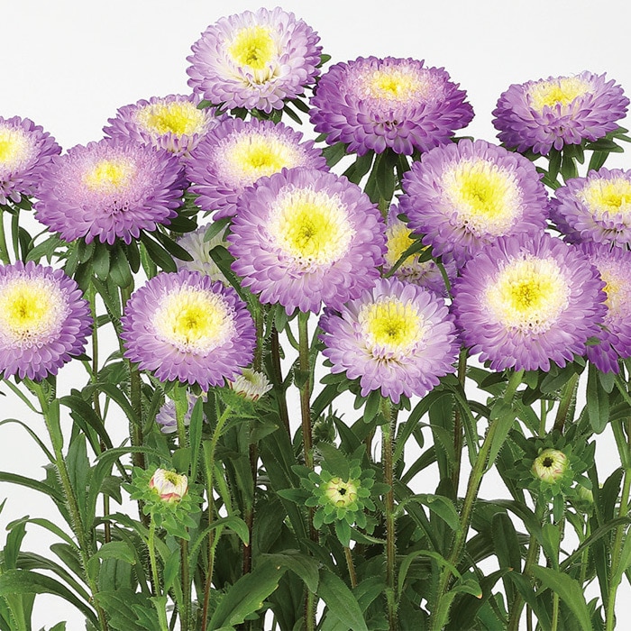 咲き進むと花色が濃くなるので、淡い色のまま楽しみたい場合は、早めに切り花にするのがおすすめです。花弁の重ねが厚くボリュームたっぷりの大輪アスター。花形の整ったポンポン咲きで、咲き進みながら表情を変えます。「松本」シリーズと同程度の萎凋病耐病性品種です。「松本」シリーズより5~7日開花が遅いです。