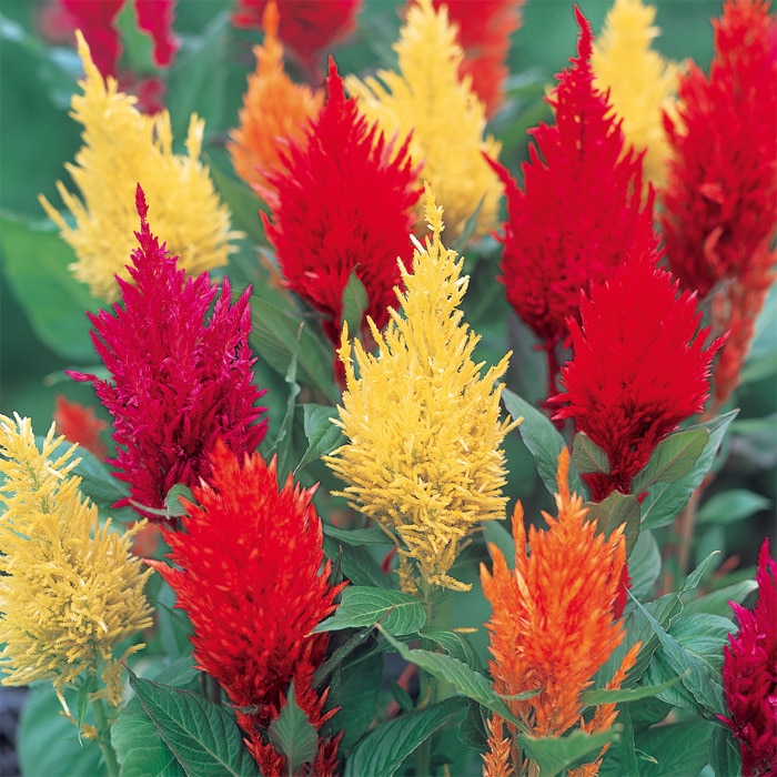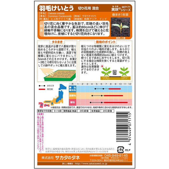 切り花に向く華やかな色彩で、花穂の長い羽毛系の混合品種です。茎は約80cmほどに伸びて緑軸や赤軸になります。株間を広げて植えると花壇向きに、密植にすると切り花向きになります。