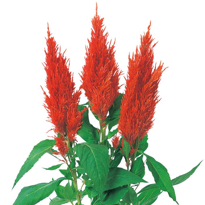 中高性羽毛ケイトウ。花穂が極めて大きくボリュームがあるのが特徴です。花壇、切り花に好適です。緋赤色で、緑葉です。