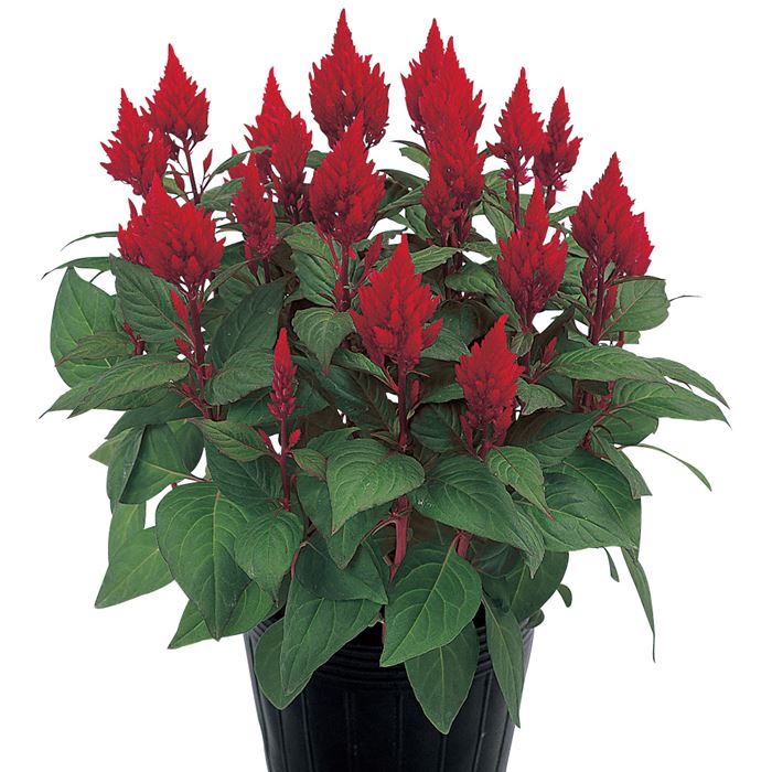 わい性羽毛ケイトウ。草丈10cmで出穂開始し、花穂は草丈の半分を占めるほどの大きさになり非常に見事です。生育がよく、自然に側枝が地際から発生し、耐暑性が強く、長期間美しい色彩を保ちます。緋紅色で、銅葉です。