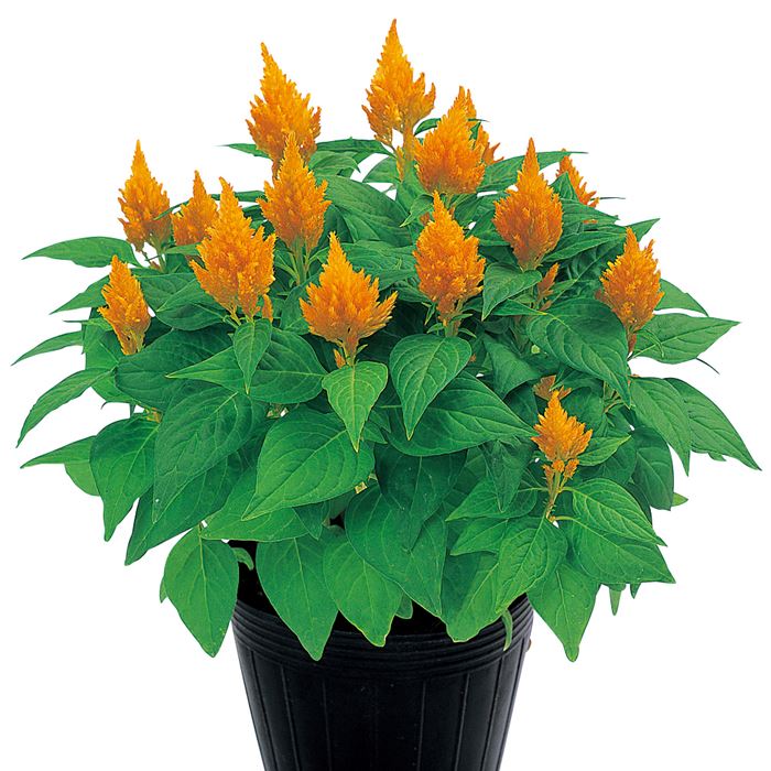 わい性羽毛ケイトウ。草丈10cmで出穂開始し、花穂は草丈の半分を占めるほどの大きさになり非常に見事です。生育がよく、自然に側枝が地際から発生し、耐暑性が強く、長期間美しい色彩を保ちます。濃黄金色です。