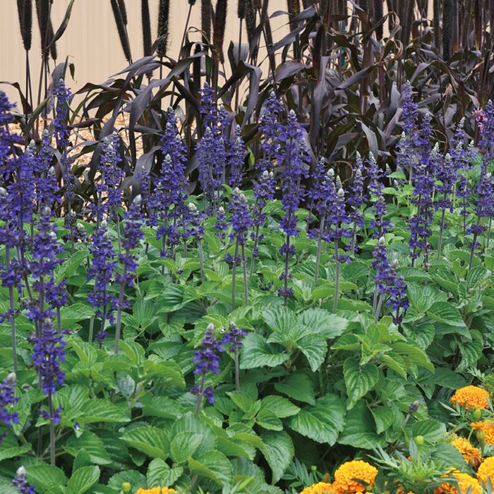 花・茎とも青く、遠目からでも青色が分かります。高さを演出するガーデンにもおすすめ。耐暑性に優れ、夏から霜が降りるころまで開花し続けます。