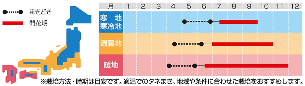 ●コンパクトな株で開花を始めるため、開花期も長い。カラフルで美しいので多粒まきにもおすすめ!