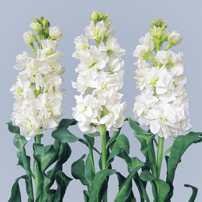 90%以上の八重率。既存のオールダブル系品種と比較して花色の純度が高く、茎が硬いです。「アーリーアロー ホワイト」よりも開花が遅い分、草丈を取りやすいです。高温期の開花では、花飛びが発生しやすくなるため注意が必要です。