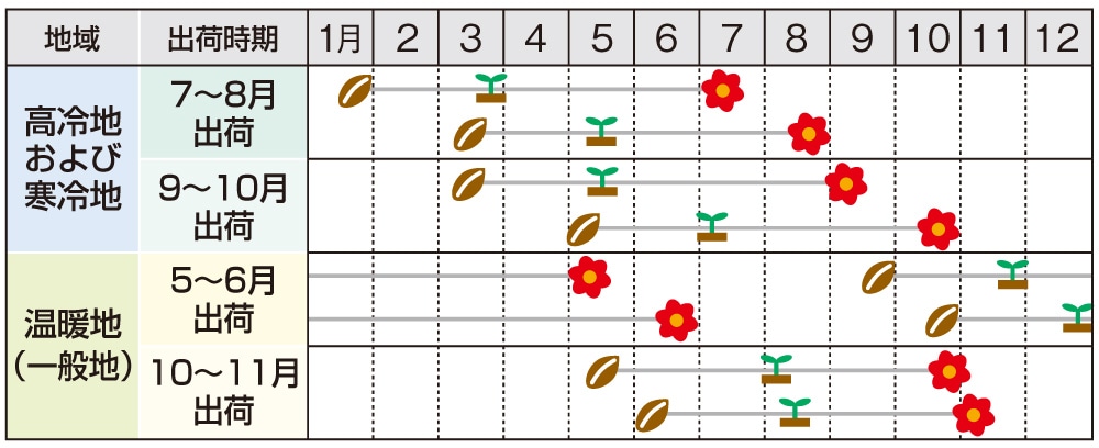 花形が整い、草丈がとりやすく、ボリュームのある草姿になります。周年栽培可能で、春から夏切り、秋切り栽培が有利です。