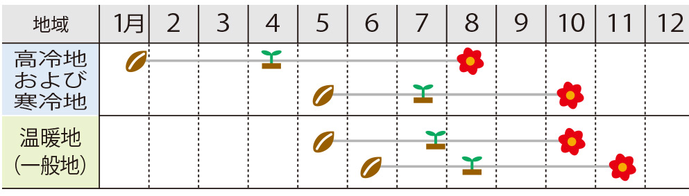 年間を通じて鮮やかな濃いレッドの花色になります。気温が低くなる時期でも花弁の青みが出にくいのが特長です。温暖地の10~11月、寒冷地の8~9月出荷がおすすめです。