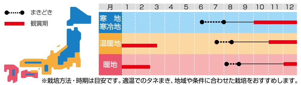 発色の早い、さまざまなちりめん系の混合種です。タネまきの時期や方法によっては、大株の花壇用や小株の寄せ植え用、小鉢の多粒まき栽培まで多彩な利用ができます。