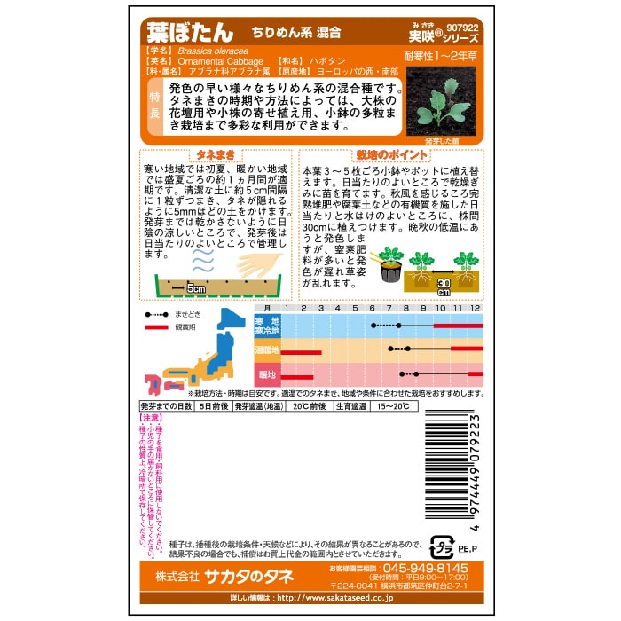 発色の早い、さまざまなちりめん系の混合種です。タネまきの時期や方法によっては、大株の花壇用や小株の寄せ植え用、小鉢の多粒まき栽培まで多彩な利用ができます。