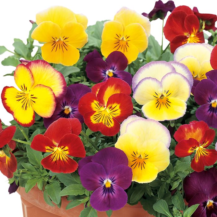 「虹色スミレ」と「よく咲くスミレ」のカラーコーディネート。タネをまくだけでナチュラルな寄せ植え風に。