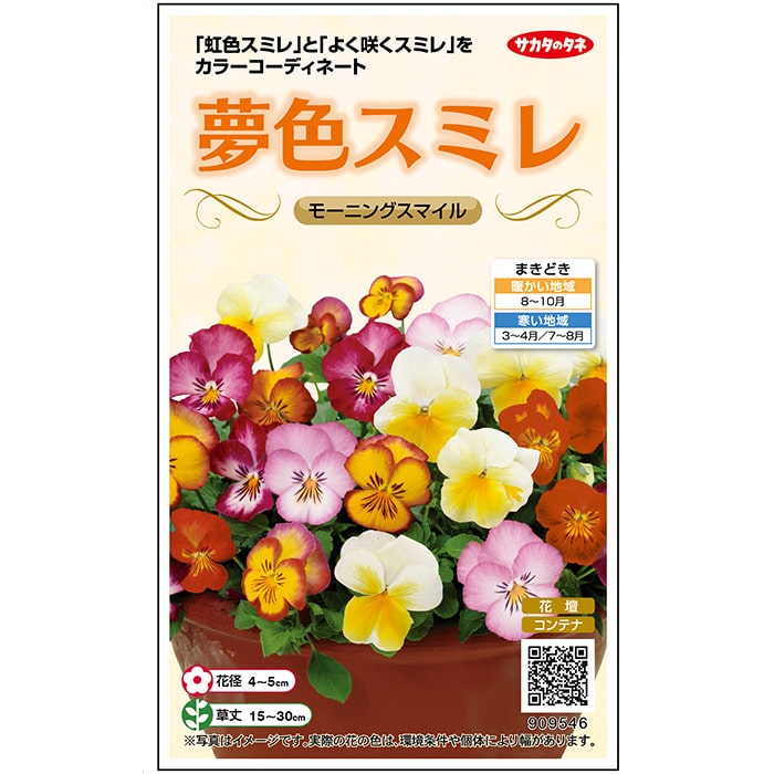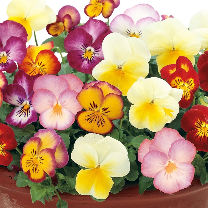 大人気の「虹色スミレ」と「よく咲くスミレ」の優しくカラフルなカラーコーディネート。タネをまくだけでナチュラルな寄せ植え風に。