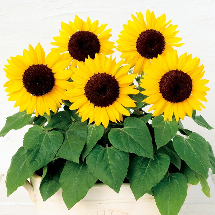 草丈約50cmのミニヒマワリ、「サンタスティック」シリーズ。草姿がしっかりして、葉色が濃い緑の力あふれるヒマワリです。花壇でもコンテナでも分枝がよく、次から次へと花を咲かせます。