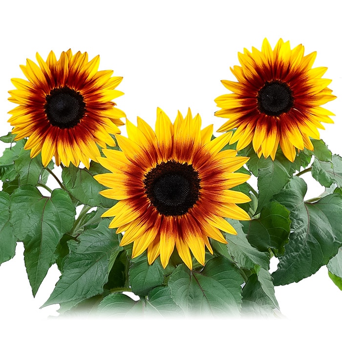 草丈25~50cmのミニヒマワリ、「サンタスティック」シリーズ。草姿がしっかりして、葉色が濃い緑の力あふれるヒマワリです。花壇でもコンテナでも分枝よく、次から次へと花を咲かせます。無花粉種、分枝系。