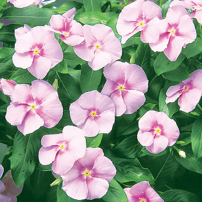 薄桃色の大輪丸弁が魅力です。花径約6cmの丸弁で、基部分枝が早く、側枝の開花も早い。各色のそろいも抜群で、多花性の極わい性品種です。