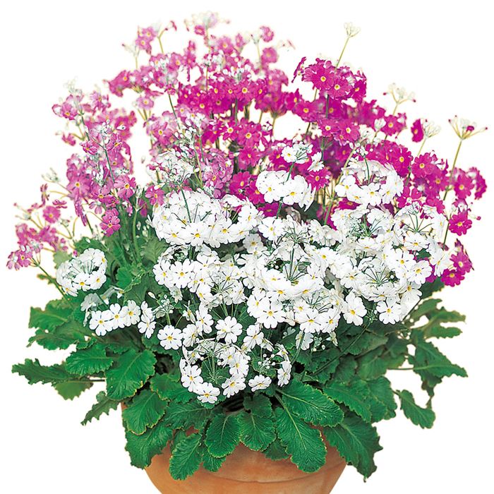 プリムラの仲間の中でも、特に寒さに強く育てやすい品種です。コンパクトな株のうちからたくさんの花茎が上がり、株を覆い尽くすほどに花が咲きます。